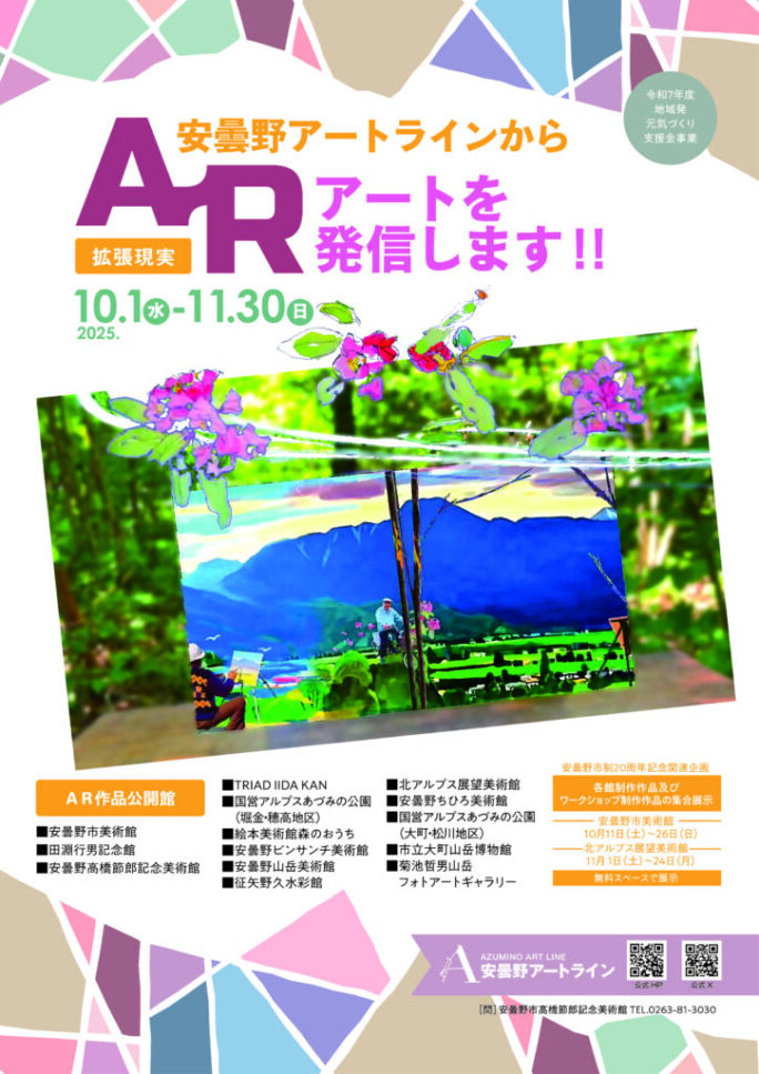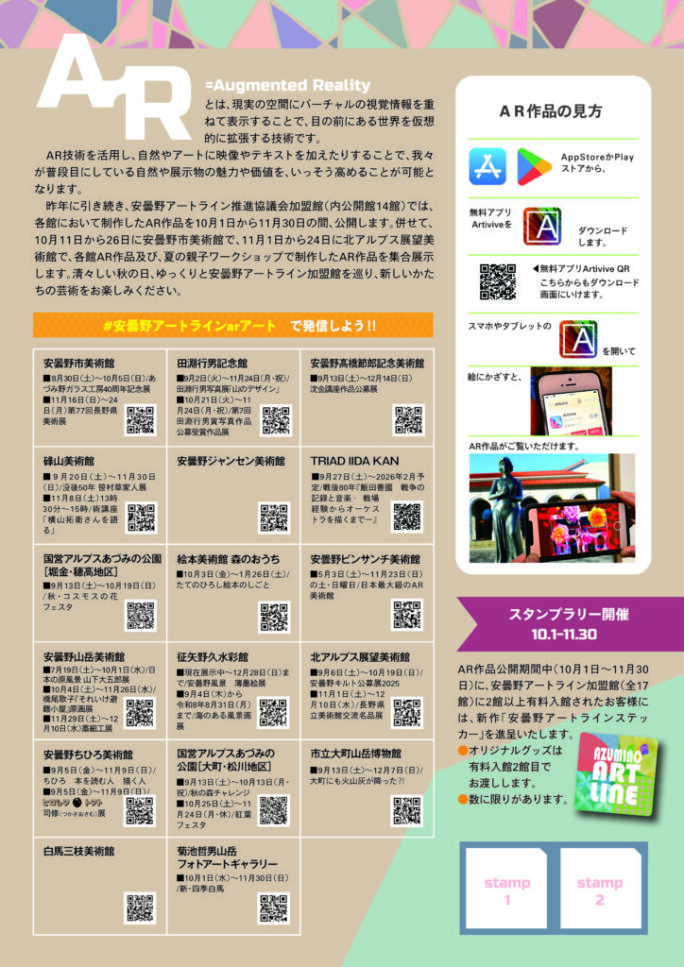 安曇野アートライン推進協議会加盟館では、昨年度に続き、令和7年度地域発元気づくり支援金事業を活用し、各加盟館にて制作したAR作品を10月1日(木)より11月30日(日)の間、制作館において展示いたします。併せて、スタンプラリーを開催し、有料で2館入館された方に、「安曇野アートラインステッカー」を進呈します。
